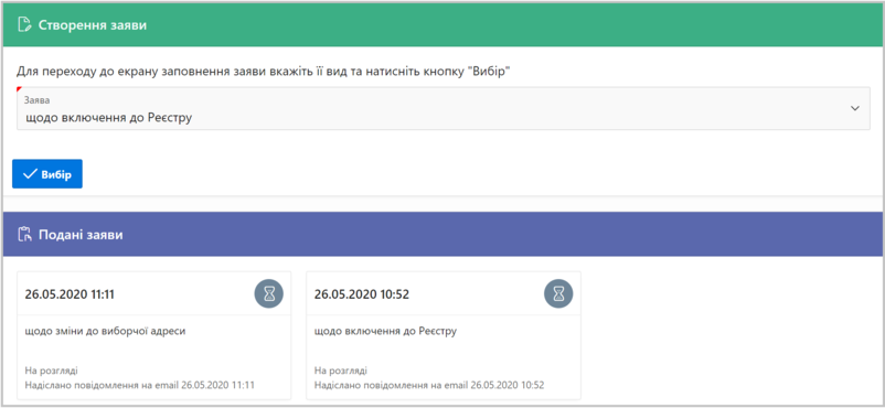 Інформування про подачу заяви, її опрацювання здійснюється повідомленнями на вказану Вами адресу електронної пошти (email). Також цю інформацію можна побачити в цьому екрані в розділі "Подані заяви", який буде присутній у разі успішної подачі Вами заяви.