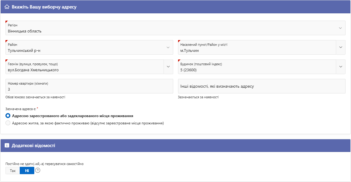 У разі, якщо обрана виборча адреса знаходиться в межах території, де тимчасово не функціонують органи ведення Реєстру, необхідно також обрати в розділі "Оберіть орган ведення Реєстру, який буде розглядати заяву" орган ведення Реєстру, який буде розглядати Вашу заяву. Рекомендуємо вказувати той орган, який найближче знаходиться до Вашого поточного міця перебування.