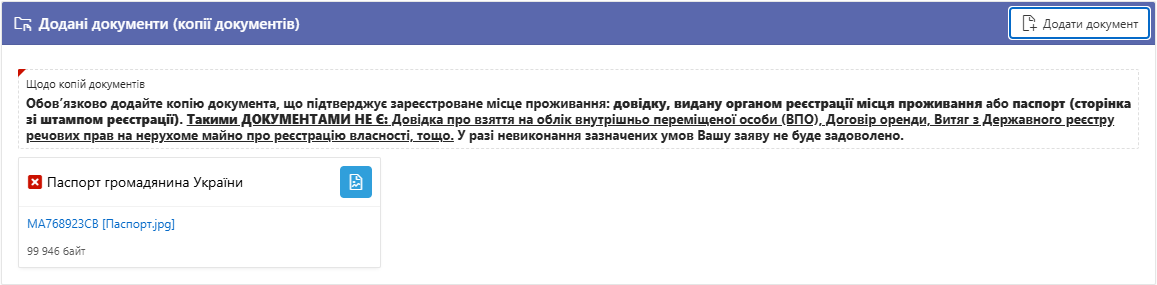 Копії документів додаються у розділі "Додані документи" натисканням на кнопку "Додати документ". Це можуть бути файли формату JPEG або PDF, кожен розміром не більше 2 Мегабайти. При додаванні копії документа необхідно зазначити його вид та реквізити (серію, номер та дату видачі).