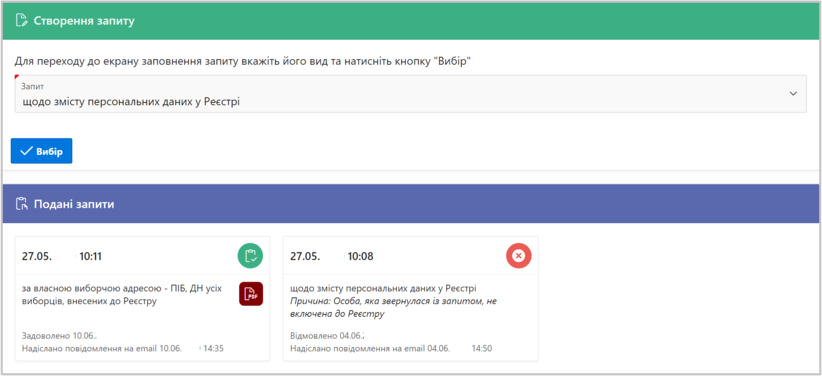 2. Відображає перелік вже поданих запитів (якщо вони існують) та стан їх опрацювання.