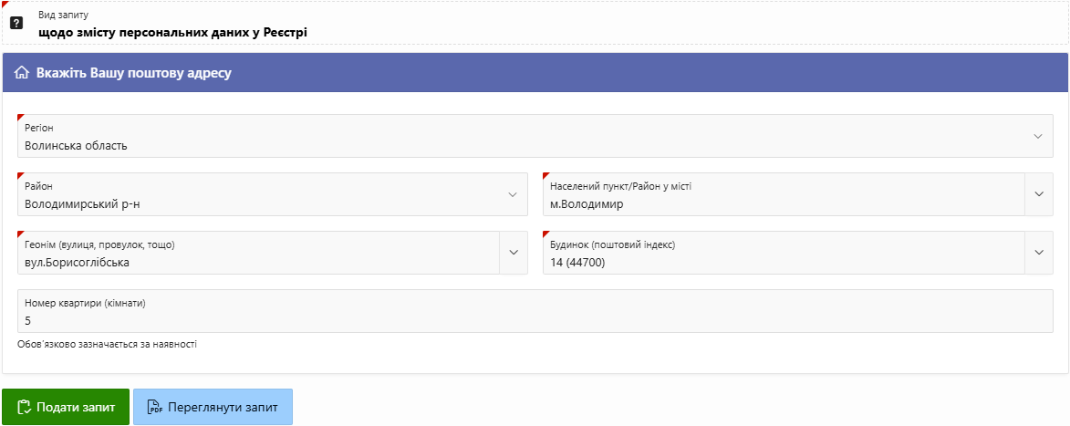 Кнопка "Переглянути запит" дозволяє побачити сформований запит у форматі PDF, при її натисканні відбувається завантаження файлу запиту, який можна відкрити та переглянути.