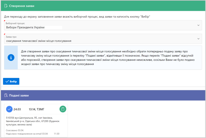 Вибір заяви для скасування тимчасової зміни місця голосування