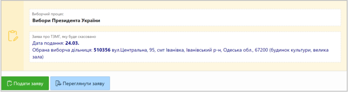 Оскільки на попередній сторінці Ви вже обрали заяву на тимчасову зміну місця голосування, яку бажаєте скасувати, то для завершення процесу подання заяви Вам необхідно натиснути на кнопку "Подати заяву".